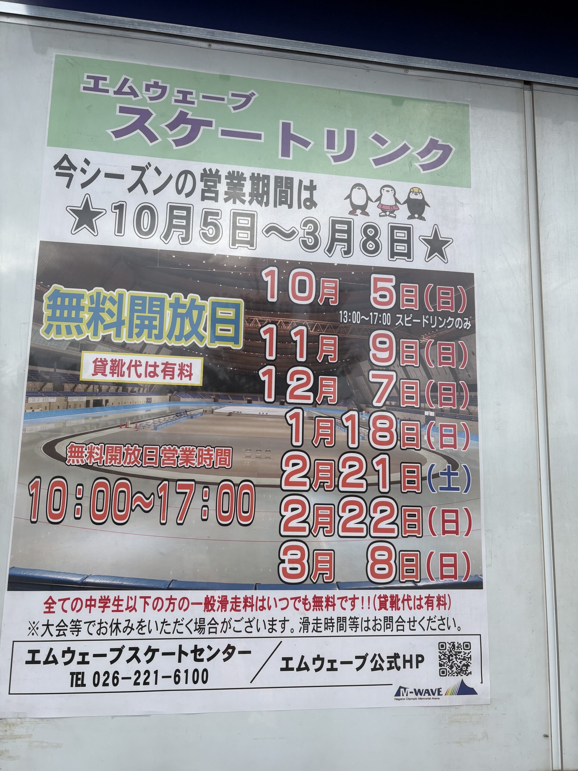 長野市にあるエムウェーブでは例年10月~3月の間、スケートリンクを営業していますが、1シーズンのうち、数日間は無料開放日となっていますので、滑走料が無料になります。