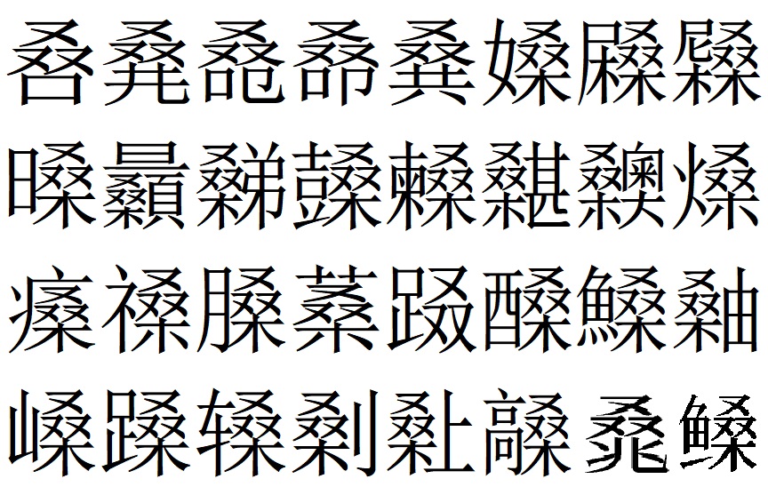 このことから、この記事では、「品」とは異なる構造でも、3つの同一の漢字から成る字については含めることにしました。